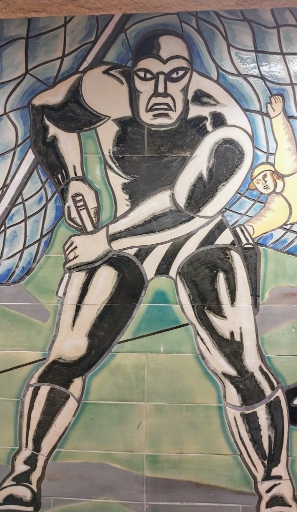 Мужчына нянчыць дзіцёнка, стаіць нешта сумны, бяжыць, верагодна, на працу, грае ў футбол і… Цягне валыну?! Цікава, што дакладна хацелі адлюстраваць гэтай фрэскай. Як зарабляць грошы?