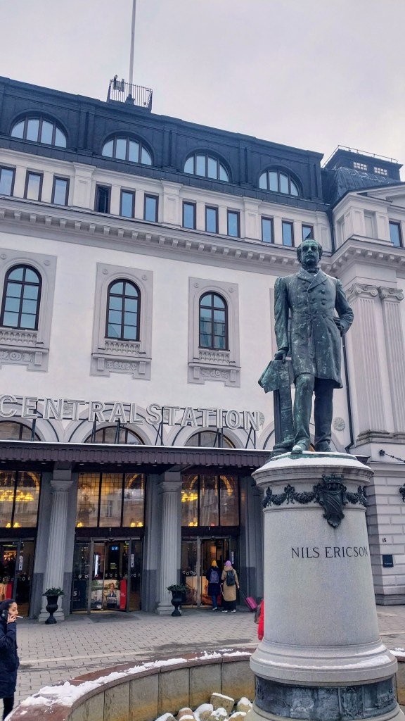 Гэтым разам не атрымалася, і я быў толькі ў Стакгольме, але вось распавяду, што на прывакзальнай плошчы усталяваны помнік Нільсу Эрыксану – гэта асноўны інжэнер праэкту шведскай чыгункі, першы цягнік па якой праехаў у 1856.