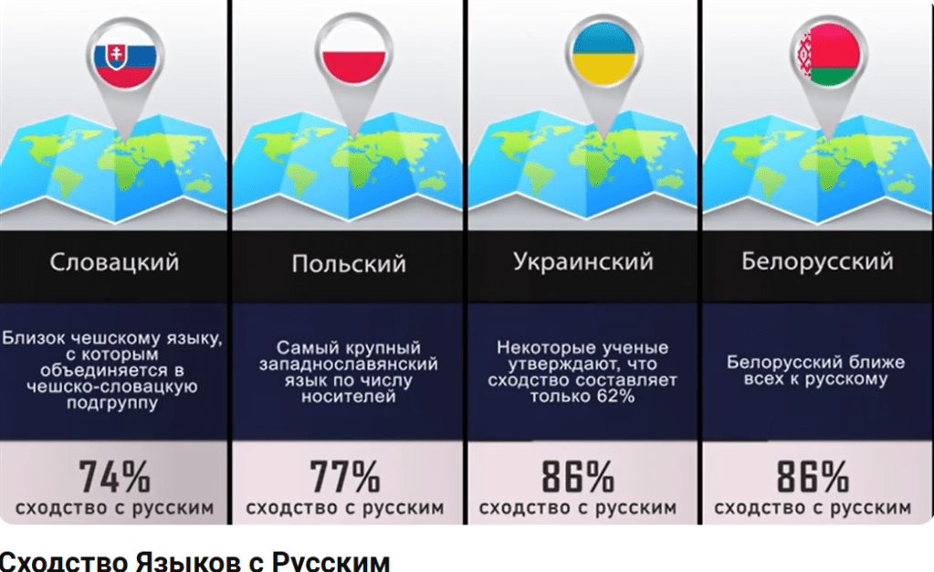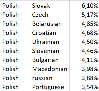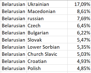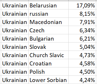 Атрымоўваецца, што акрамя 86% з расейскай, у нас па 80% з польскай і славацкай, па 77% з чэшскай, сербска-харвацкай і балгарскай, ну і ўкраінская 92%.