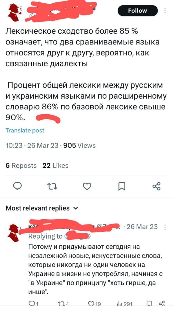 Тыя ж тэзісы разносяцца і па сацсетках. Некаторыя аўтары, каб надаць дадатковай вагі сваім словам, падкрэсліваюць, што гаворка ідзе не проста аб нейкім там абстрактным “похожі”, а вось ёсць цэлае “лексіческое сходство”, і ўвогуле, гэта не мы самі прыдумалі, а вучоныя падлічылі.
