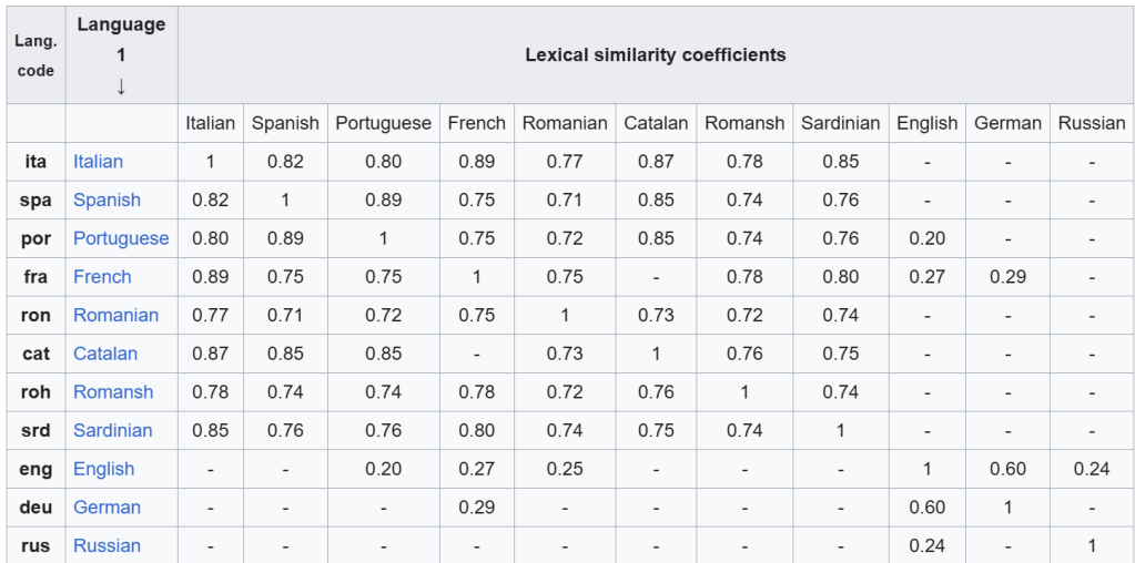 У прыватнасці, вось такая таблічка, дзе разглядаецца лексічнае падабенства розных моў паміж сабой.