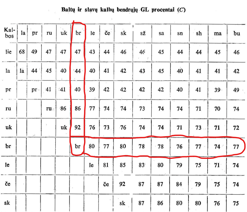 Вышэй я згадаў англамоўны артыкул на Вікіпедыі – аўтары расейскамоўнага варыянта, акрамя перакладу, заботліва падставілі вось такую таблічку, да якой дадалі спасылку на даследванне двух літоўскіх лінгвістаў ад 1994, апубліканае ў часопісе Baltistica.