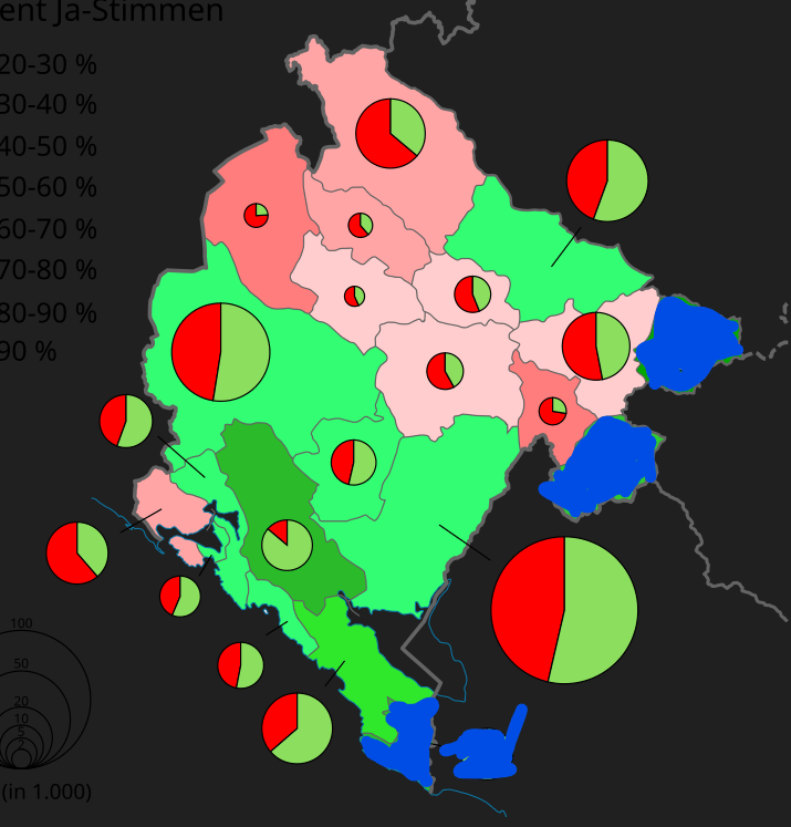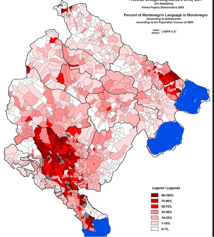 Узяў візуалізацыі as is, на мапе з мовай чым насычаней чырвоны – тым большы адсотак размаўляе па-чарнагорску, на мапе з выбарамі: зялёны – галасы за незарежнасць, чырвоны – за тое, каб застацца ў складзе Сербіі.