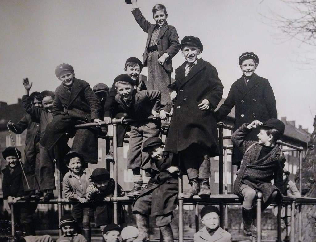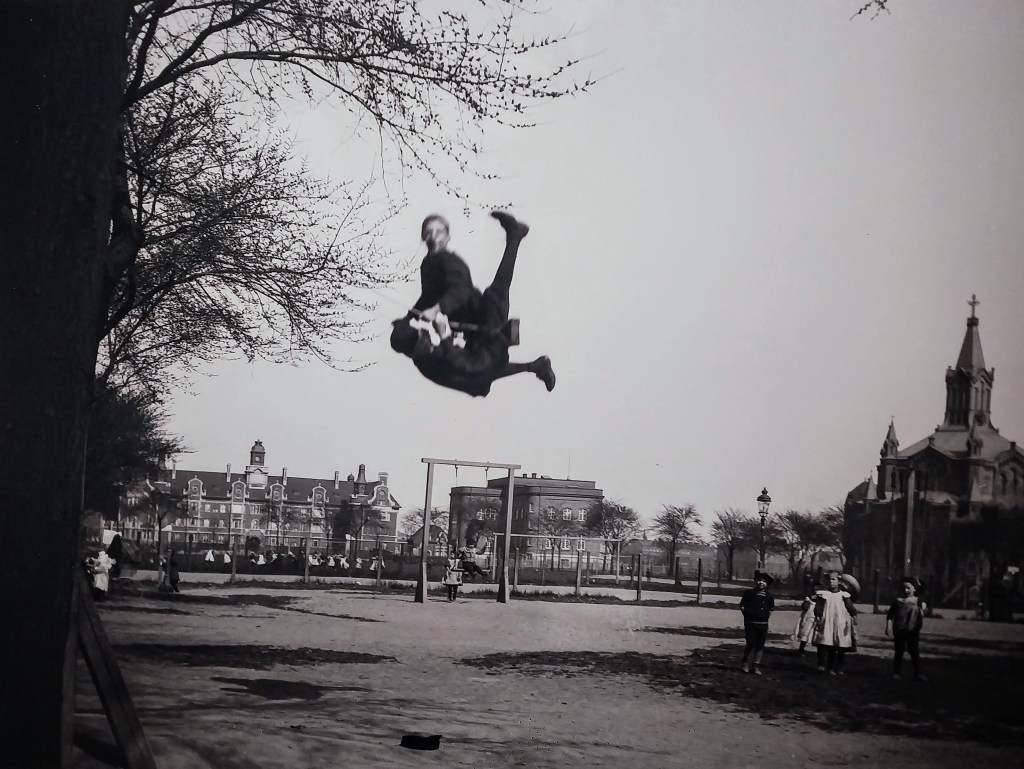 Вось хлопцы гойдаюцца на арэлях – гэта першая дзіцячая пляцоўка ў Мальмо, 1901 год.