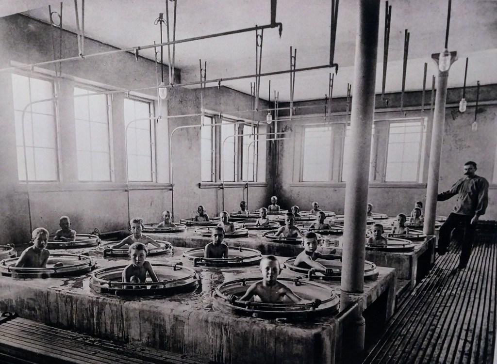 Наступны здымак, як па мне, выглядае бы кадр з фільму жахаў, але гэта школьная лазня.