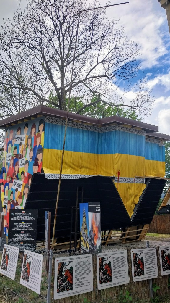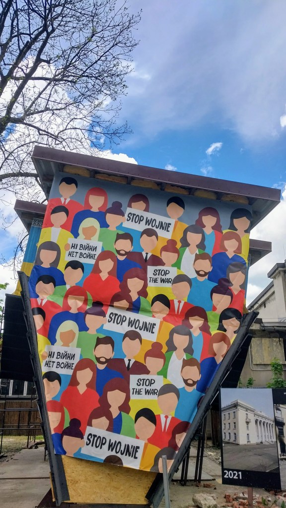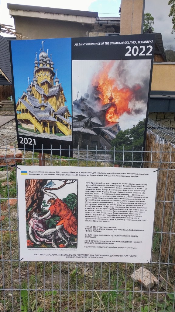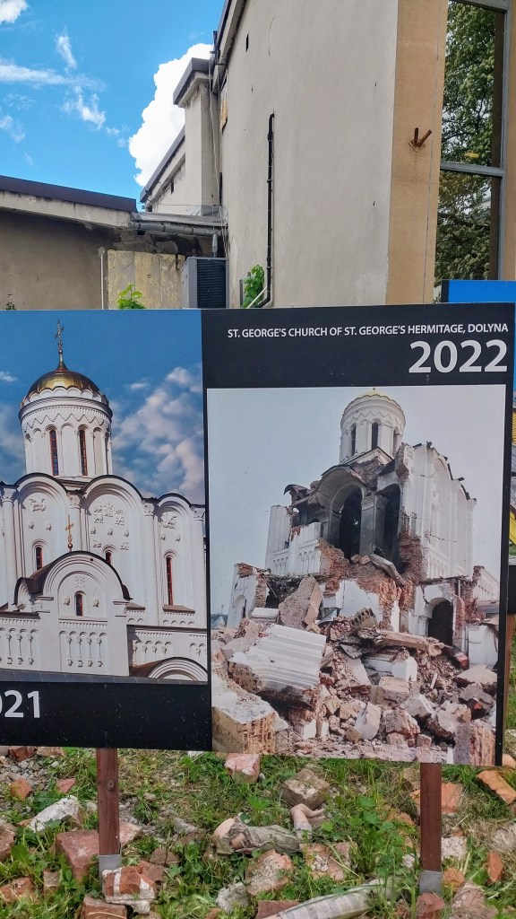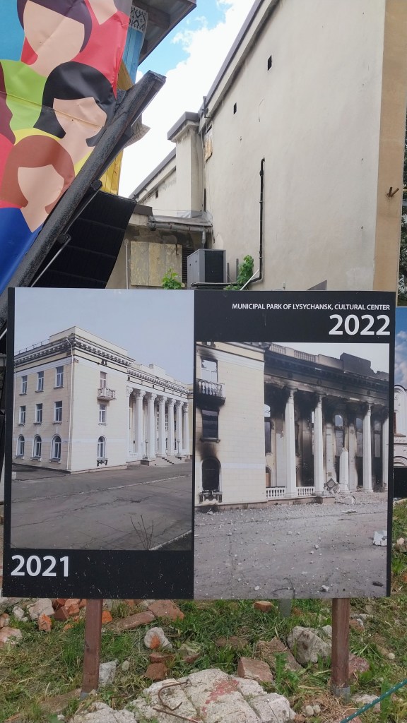 А вось такую ўсталявалі побач. З надпісу на таблічцы: “Вайна пераварочвае жыццё украінскага народу дагары нагамі і беспаваротна знішчвае культурную спадчыну Украіны”. Прыклады некалькіх (з тысяч) разбурэнняў, якія здейснілі падманутыя асабіста пуціным наші мальчікі.