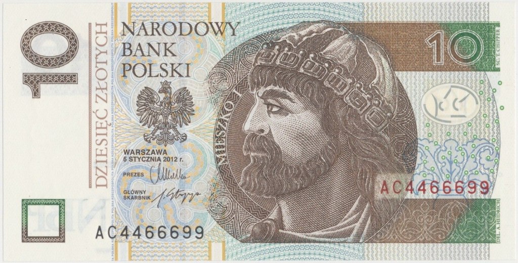 На аверсе банкноты ў 10 злотых – князь Мешка I (960-992, тут і далей – гады кіравання), на рэверсе – срэбная манета таго часу.