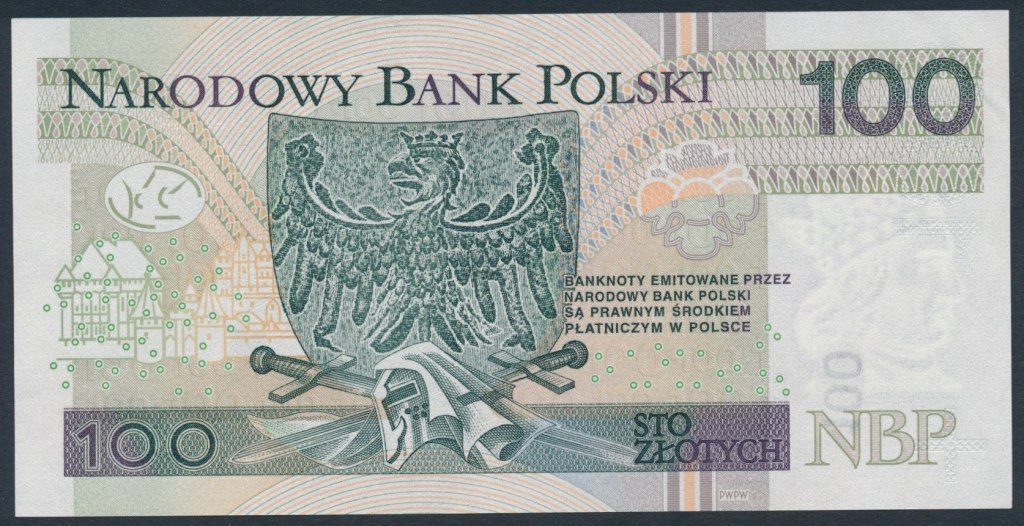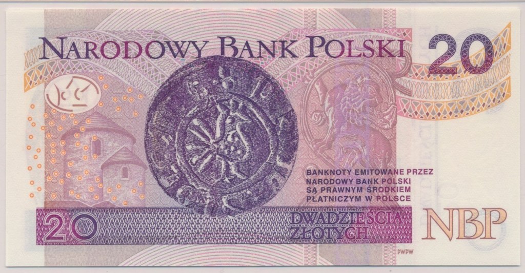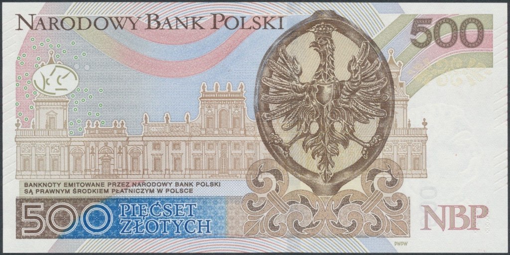 На рэверсе банкноты на фоне двара Вавельскага замку ў Кракаве – выява арла з капліцы, адпаведна, Вавельскага сабору.