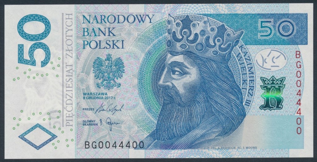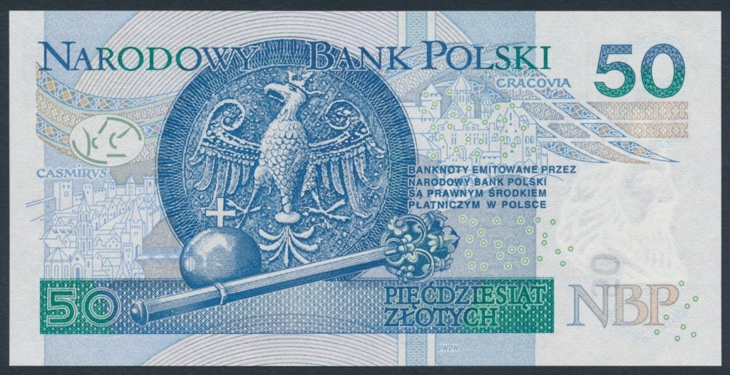 50 злотых пераносяць нас да апошняга караля дынастыі Пястаў Казімера III Вялікага (1333-1370). На рэверсе – панарама Кракава і асобна выява габрэйскага району Казімеж (разумееце, на гонар каго названы).